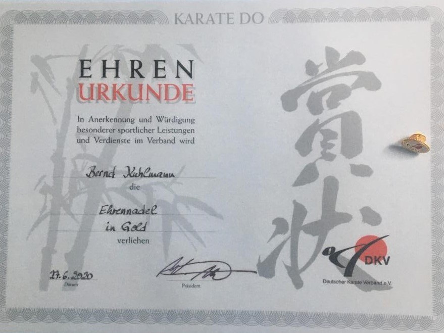 Damit aber nicht genug, zeichnete der DKV den Gründer und jetzigen Ehrenvorsitzenden des KCS Bernd Kuhlmann für seine Verdienste als Vereinsleiter, aber auch für seine nationale internationale Arbeit für unseren Kampfsport mit der Goldenen DKV-Nadel mit Urkunde aus.