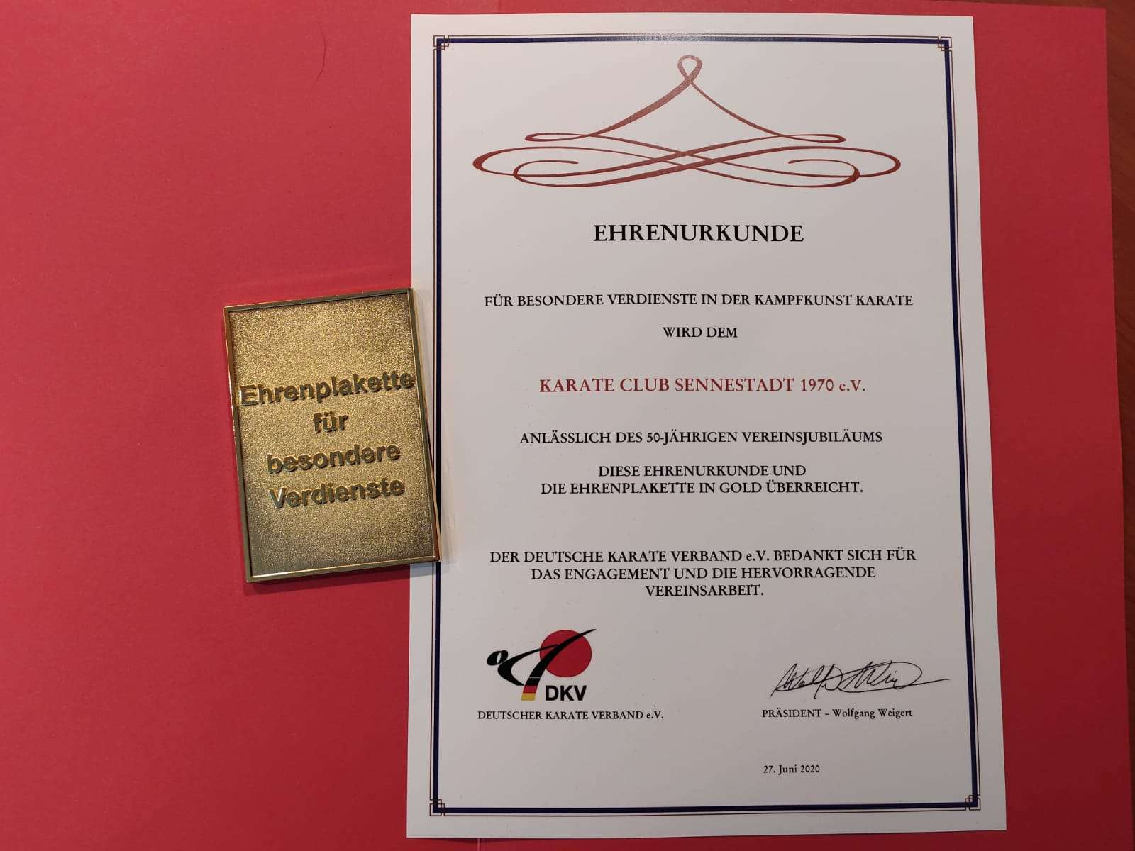 Der DKV (DEUTSCHER KARATE VERBAND) ehrte den Karate Club Sennestadt für sein 50-jähriges Bestehen und seine hervorragende Vereinsarbeit. Dafür überreichte der Bundesstilrichtungsreferent Hans Wecks, 9. Dan, unserem Clubvorsitzenden Peter Falk im Auftrag des DKV die Ehrenurkunde und die dazu gehörende Goldene Verdienstplakette.