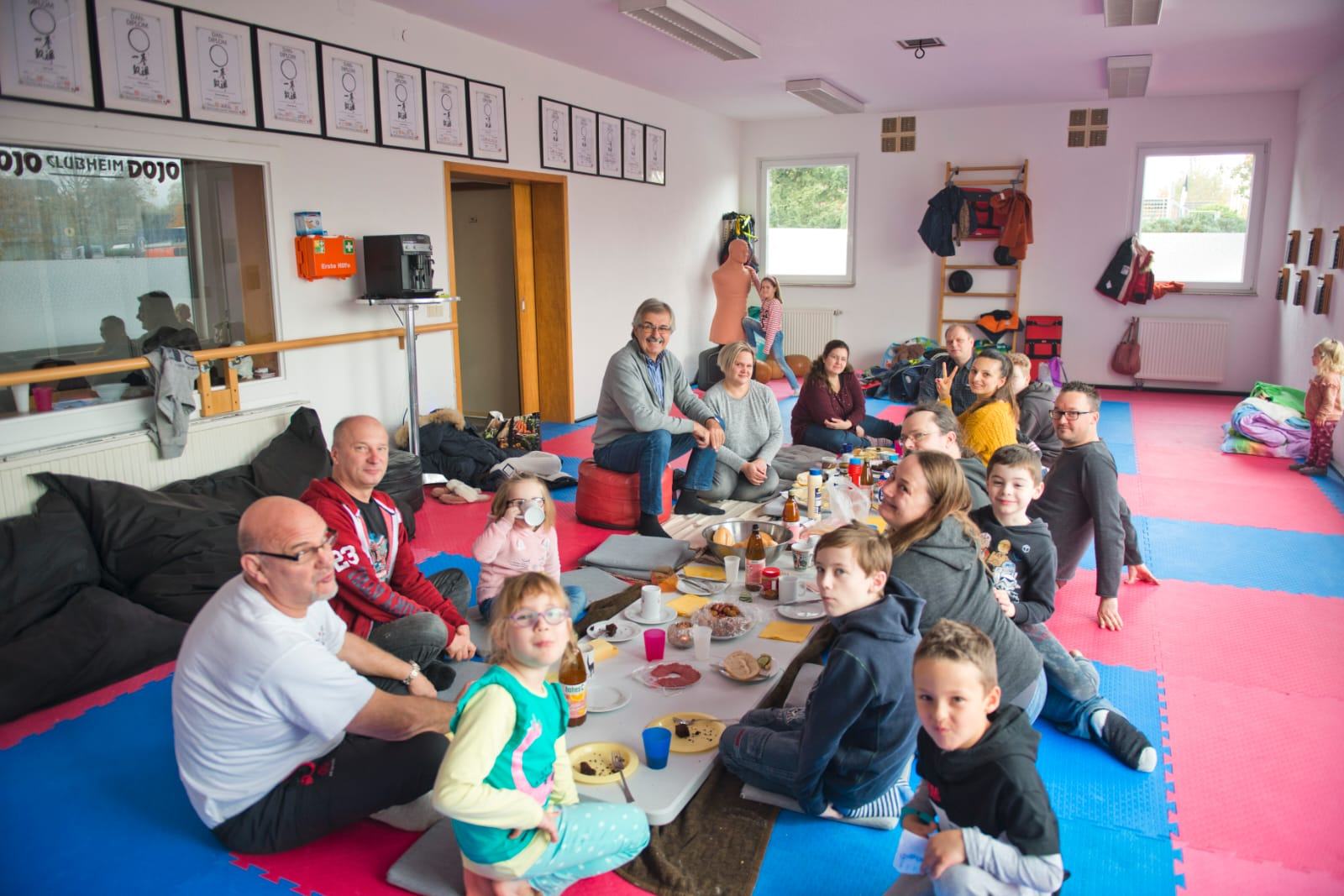ben sich nach einem anstrengenden Abend zur Bettruhe! Zum Erstaunen der Betreuer*innen konnte man ab 22.00 Uhr nur noch das gleichmäßige Atmen der Kinder hören, alle schliefen tief und fest und schöpften Kraft für den nächsten Morgen. Nach einer ruhigen Nacht musste am nächsten Morgen erstmal das Bettenlager abgebaut werden, denn alle Eltern waren zu einem gemeinsamen Frühstück eingeladen! Traditionell wurde nach japanischem Vorbild im seiza ( sei=korrekt; za=sitzen) gesessen und gefrühstückt. Jeder trug seinen Teil zum Frühstück bei und ergänzte das leckere Fühstücksbuffet zu einem Frühstücksevent mit Jung und Alt!